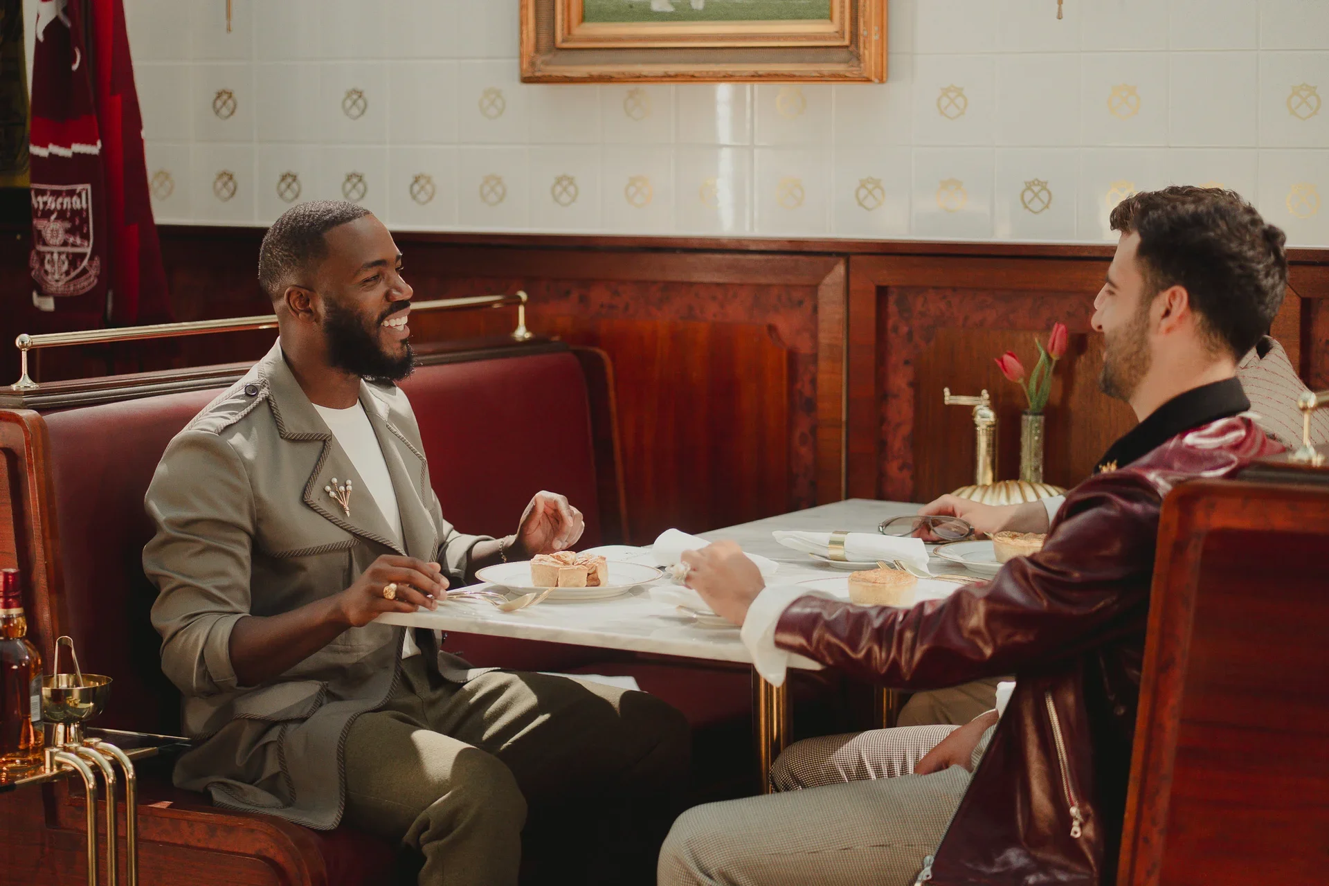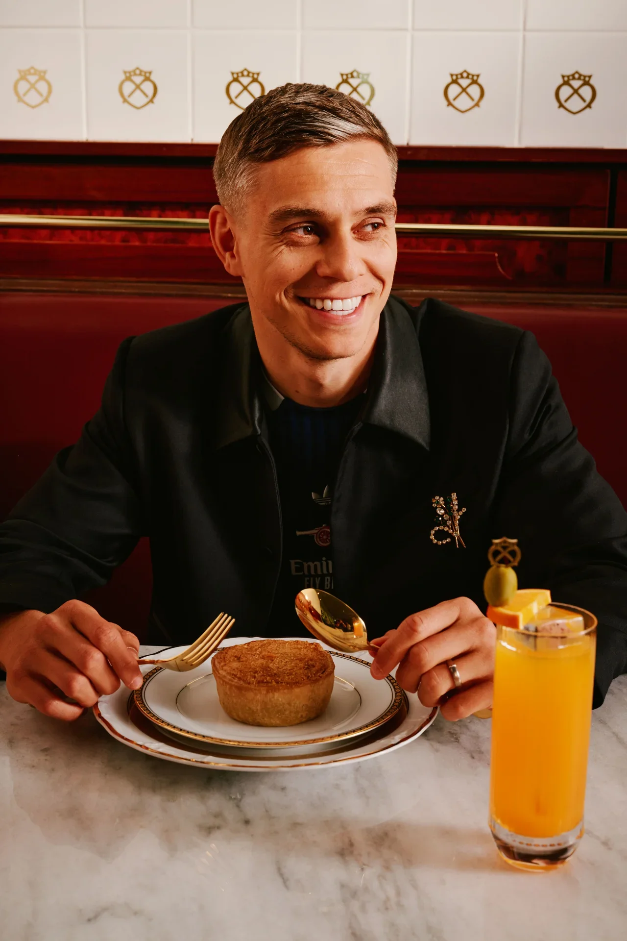 character-led portraits of arsenal players, shot as if they were regulars at the pie shop, with the pie and whisky bottle centre stage